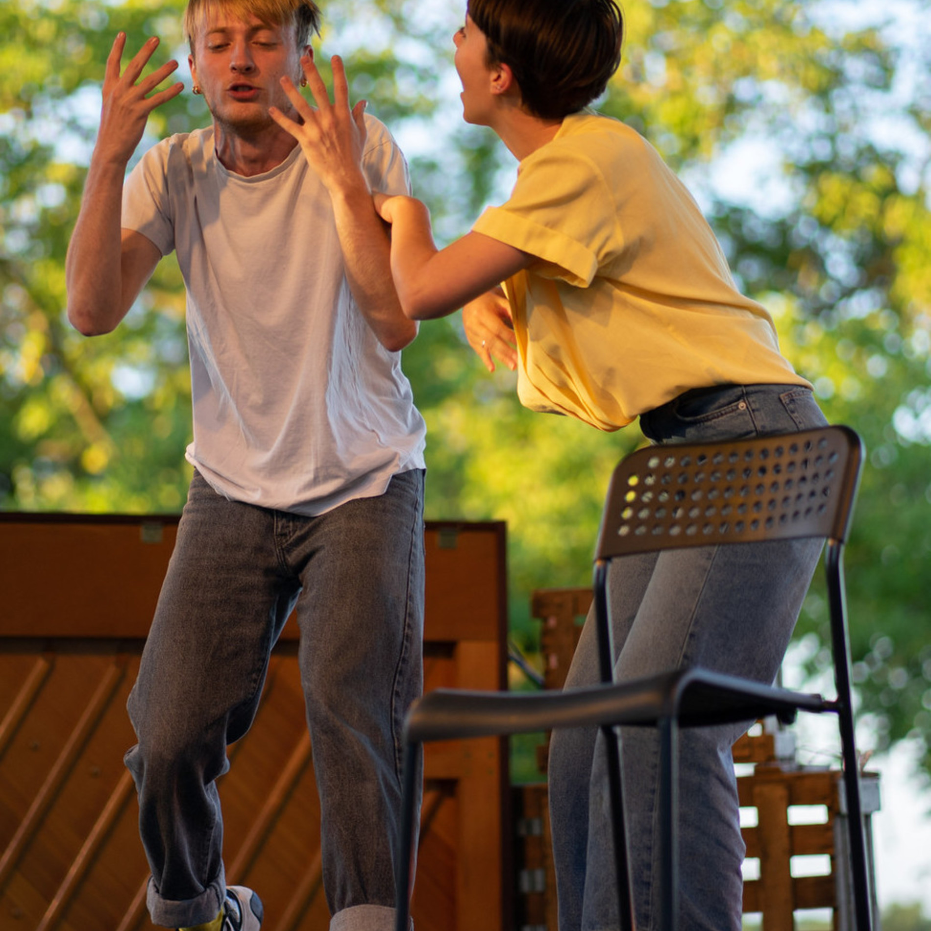 Jérémie Nicolet est comédien et musicien genevois. Tombé jeune dans le théâtre, il se forme aux Teintureries à Lausanne, ce qui l’amène à travailler avec le GDRA ou encore le duo Delforian/Tagliarini. C’est sous le nom de Hibou ! qu’il développe son projet musical solo, un mélange de rap, slam et chanson sur des fonds mélodiques qu’il compose, écrit et enregistre lui–même. Son nid construit fermement sur les branches voisines du théâtre et de la musique, il alimente continuellement sa pratique de l’une avec l’autre, à l’instar de son premier solo de théâtre, RC, qui reprend les codes d’une battle de rap pour explorer les enjeux d’échec, de solitude et de recherche d’encouragement dans un contexte absurde. Après un EP sorti en 2022 et deux albums en 2023, il continue à développer son projet musical en cherchant à y appliquer les outils du théâtre. Il collabore régulièrement avec Yann Hermenjat et Maude Bovey, et est accompagné par la Cie L’Alakran pour sa prochaine création théâtrale en duo avec Georgia Rushton.