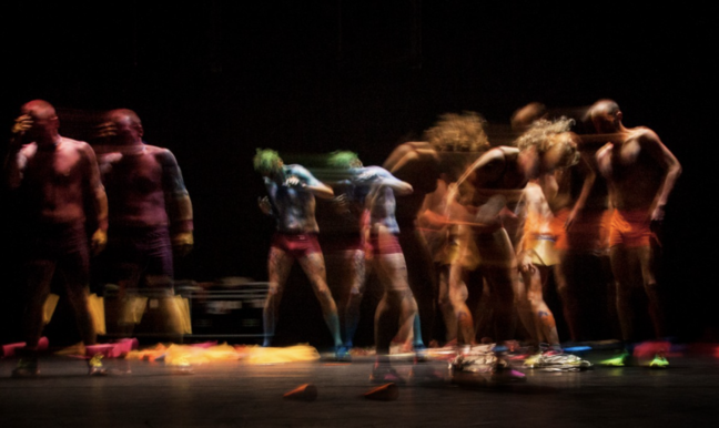 Ballroom, c’est une fête hallucinante et hallucinée : une danse physique, éruptive, une danse de l’excès et de la démesure, de la dépense et de l’épuisement. Dès l’ouverture des portes, on est happés par l’effervescence des préparatifs. Six interprètes se griment, fabriquent leur costume à coup de ciseaux, bougent, causent, interagissent avec nous. L’excitation grimpe, les basses de la techno, les rythmes percussifs de la pizzica et de la batucada enveloppent et pénètrent les corps.